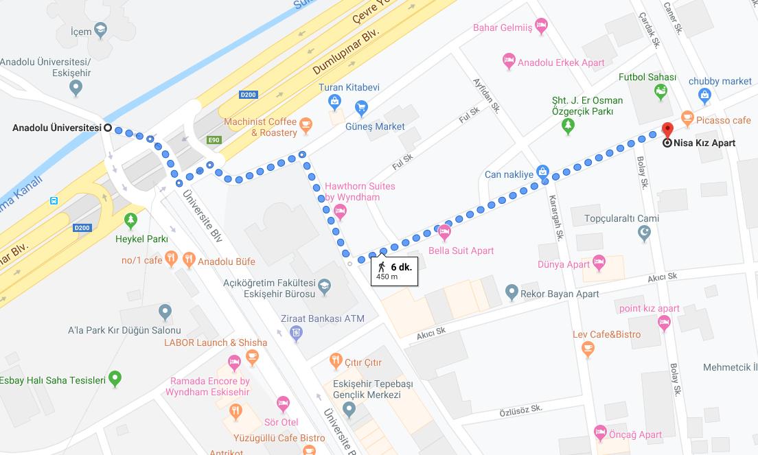 Anadolu Üniversitesine yürüyüş mesafesinde olan Nisa Kız Apart yürüyüş ile 450 metre uzaklıkta ve 6 Dakikada Anadolu Üniversitesine ulaşabilirsiniz.